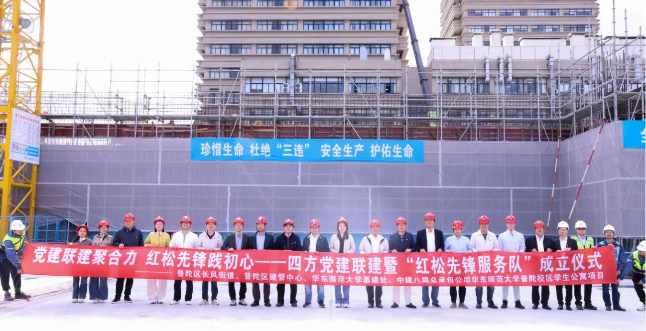 10月22日,华东师范大学基建处党支部在普陀校区新建学生公寓工程项目现场举行普陀校区学生公寓项目党建联建暨“红松先锋服务队”成立仪式。基建处党支部、长风新村街道党工委、普陀区建筑业管理中心第二党支部、中国建筑第八工程局有限公司总承包公司第三分公司党总支党员代表出席。