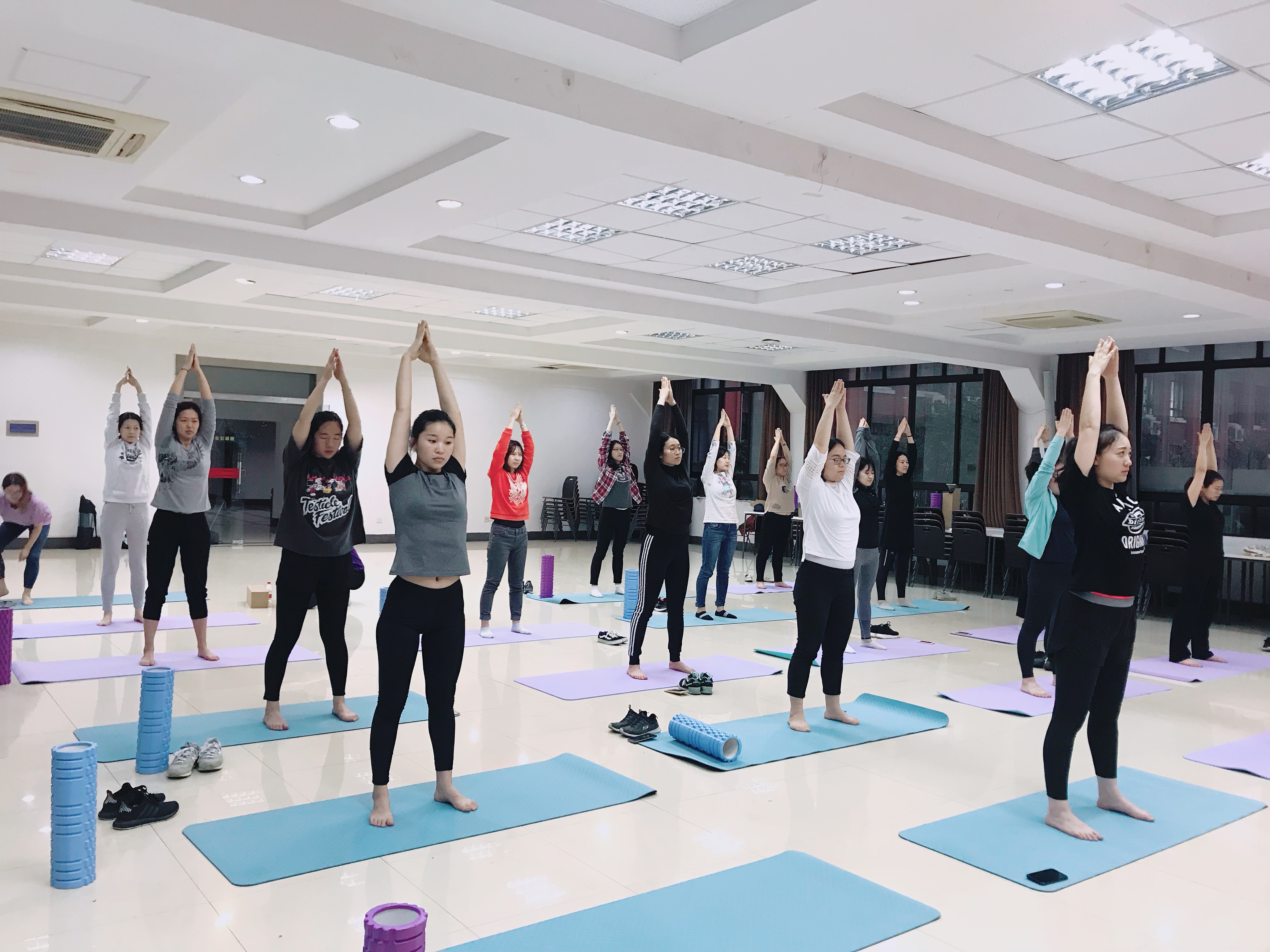 在机关青年联谊会理事成员们前期积极的群策群力和紧锣密鼓的筹备下,第一次快乐健身课已于4月2日晚,在中北校区物理楼一楼活动厅正式开班,来自学校机关各部门30多名教师参加了此次“快乐健身班”,目前已授课三次。本期健身班于每周二的晚上开展,一共安排12次健身课程,健身班邀请到我校体育与健康学院研究生张岩担任指导教师。张岩具有丰富的授课经验,多次参加国家及省级比赛,并曾获得一等奖。开课前机关青年联谊会还为学员们精心准备了瑜伽垫和泡沫滚轴。